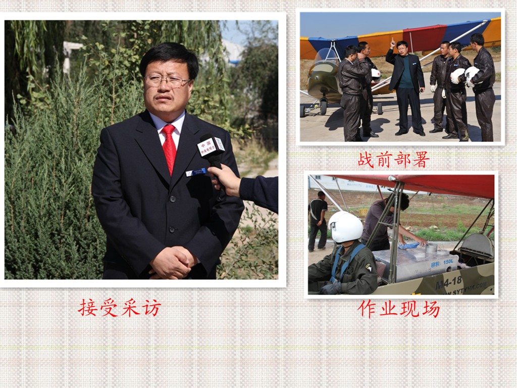 ,而是毅然決然的走上里一條充滿艱辛的打拼之路,在別人笑之為天方夜譚的情況下,1999年四處投親靠友籌集資金從北京航空航天大學購進了一架蜜蜂4超輕型飛機,與此同時它成就了內蒙古自治區(qū)第一個私人擁有飛機的人,飛機有了,他東奔西走,開始學習、探索、研究制作超輕飛機飛機播種和飛機滅蟲設備,經過4年的反復試驗,終于在2003年設備試驗成功,但沒有相關手續(xù)私人飛機不允許私自飛行,于是成立航空公司的想法在心中勾畫,他開始了中國第一家超輕型飛機通用航空公司的籌建工作,一己之力不可成江河,于是他伙同一直支持他的妻子四處請專家、找能人,終于在2006年經過三年努力國家民航華北地區(qū)管理局為其頒發(fā)了通用航空公司籌建許可證,于是他又四處籌措資金,投入到籌建工作之中,2008年六月經民航華北地區(qū)管理局驗收合格并頒發(fā)通用航空運營許可,與此同時他的飛機播種、飛防滅蟲兩項實用新型專利獲得通過,國家知識產權局頒發(fā)了實用新型知識產權證書。(鏡頭七)設備特寫(包括專利證書)邱志剛一個不屈不撓的東北漢子,在平凡的人生道路上創(chuàng)造了不平凡的業(yè)績,創(chuàng)造了不平凡的人生價值。創(chuàng)造了人生的豪邁與神奇。